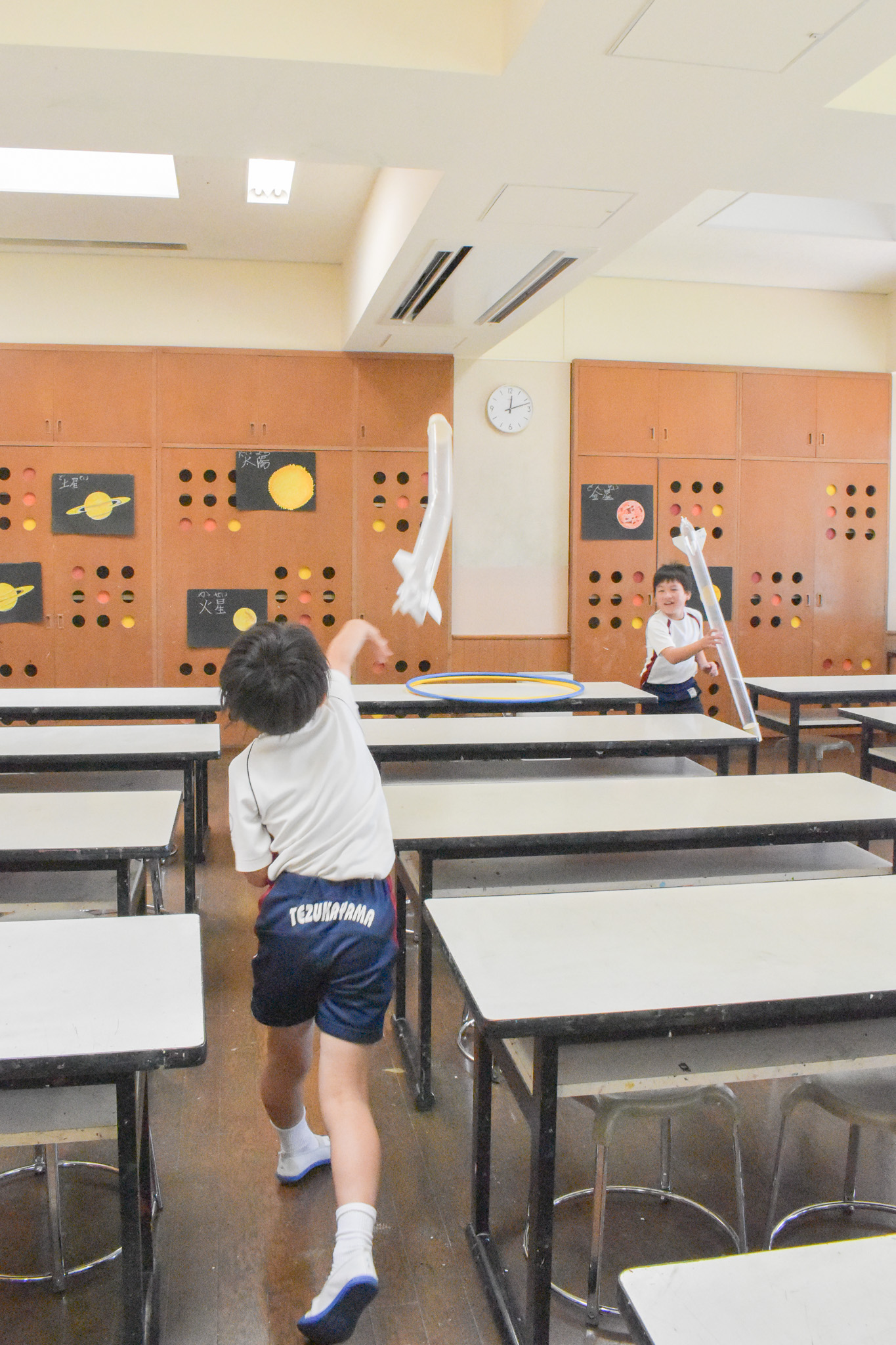 力の入れ方、角度、手を離すタイミングを変えるなど子どもたちみんな工夫して飛ばしていました。