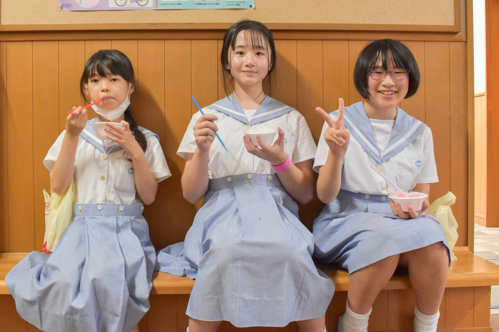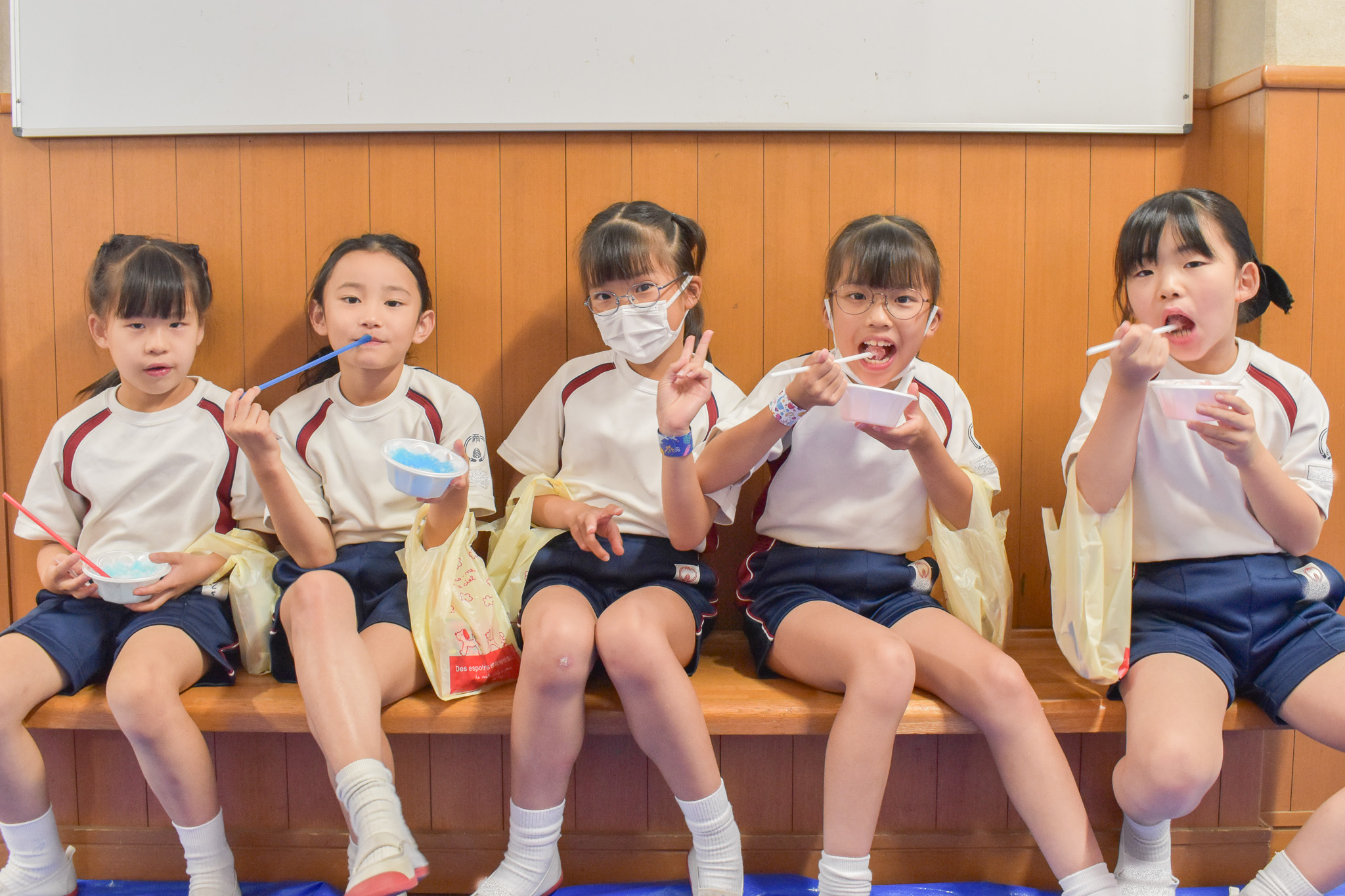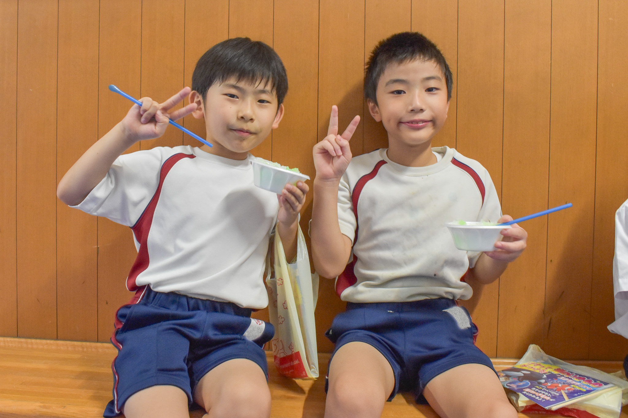 子どもたちみんな冷たいかき氷を片手に笑顔いっぱいで食べていました。