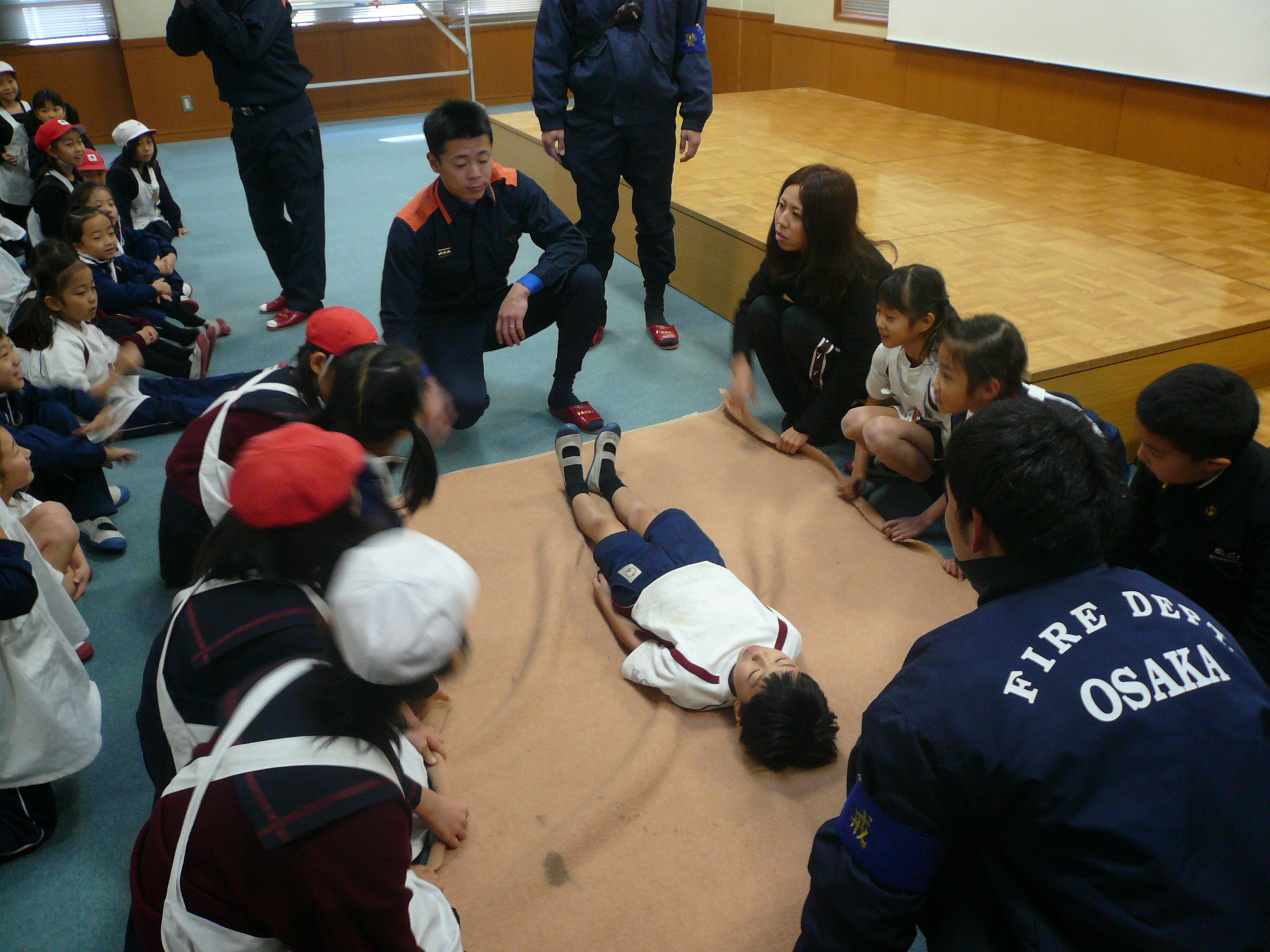 2年生では、毛布による傷病者搬送や、煙ハウスなどを体験し、、