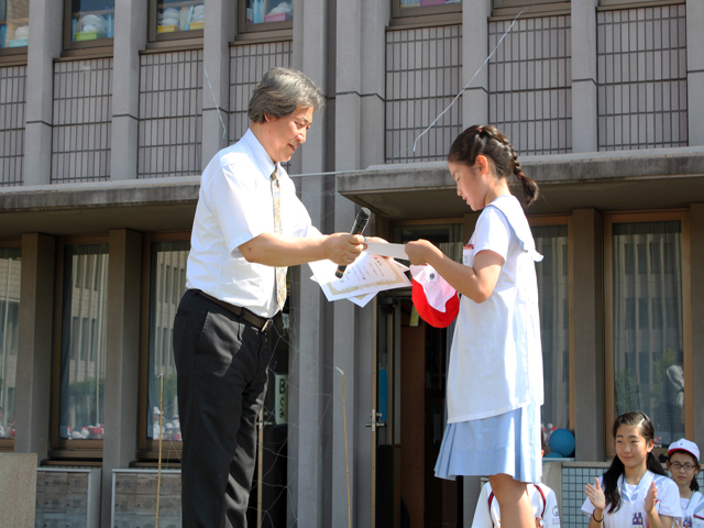 本日、外朝礼にて昨日行われた児童会役員選挙の認証式が行われ、新しい役員に認証状が渡されました。