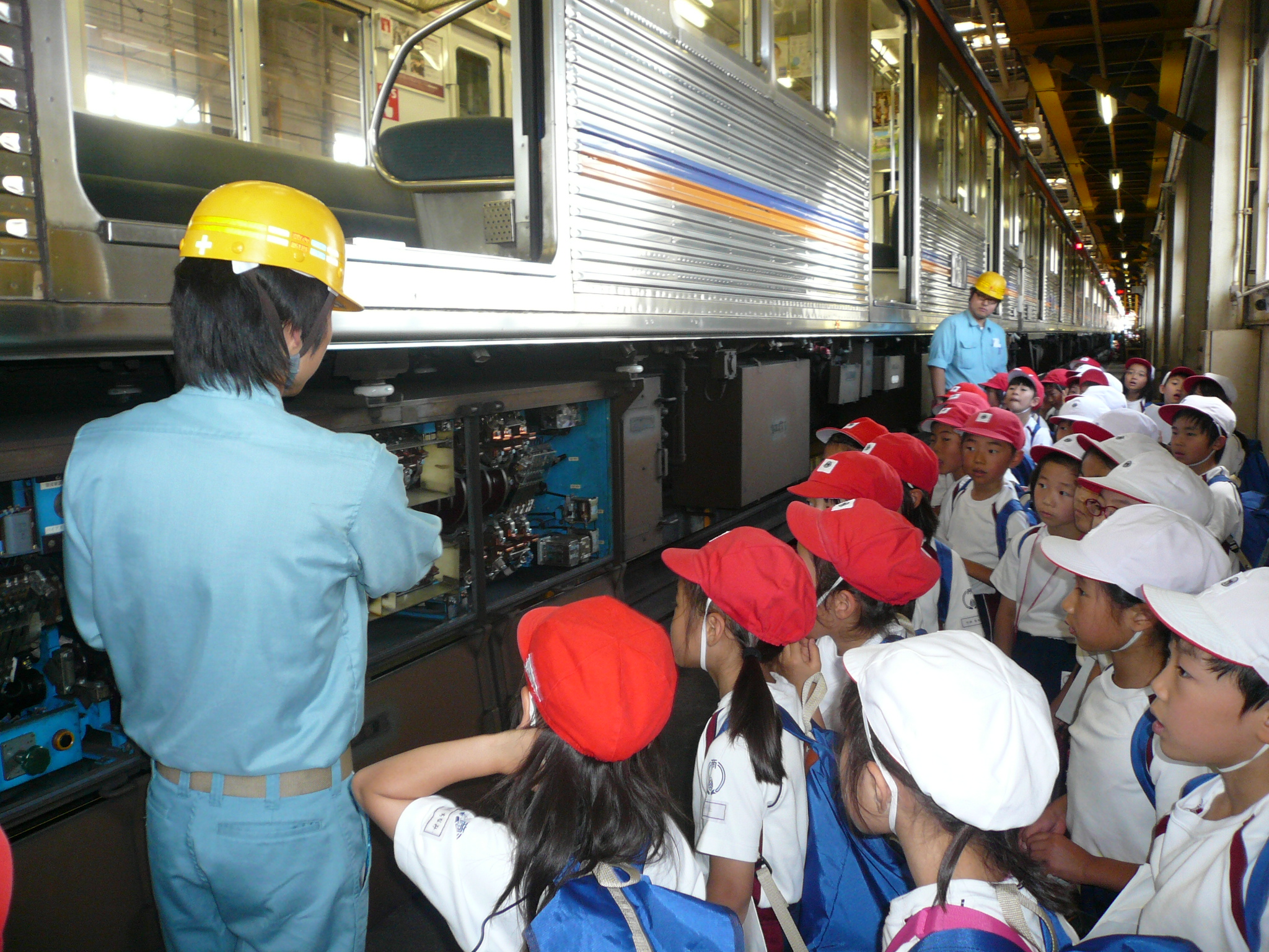 いつもはホームに隠れていて見えない車輌の下部分や車輪、ドアの開くしくみなどを見学し、