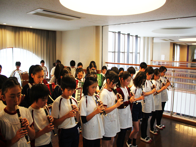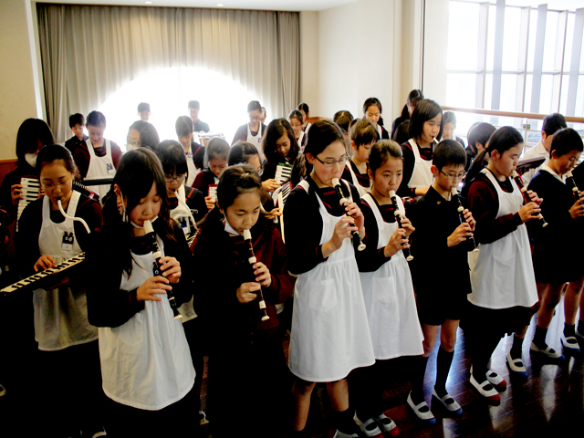 演奏する5年生は集中して自分達の音をきき合い、低学年のお客さんは興味津々の様子で、