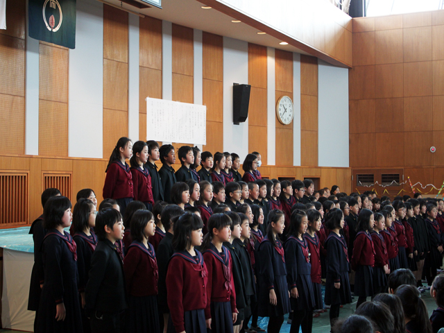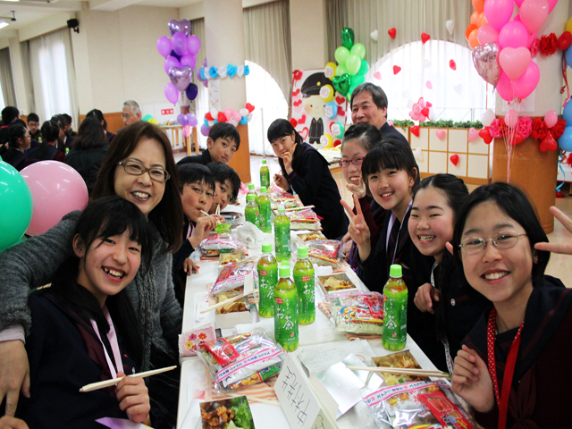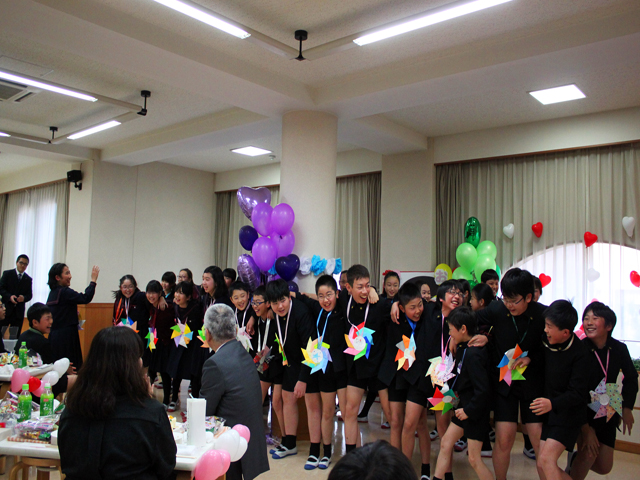 その後、給食場で「祝賀の集い」があり、軽食を食べながら、各クラスの歌を聞いたり、ゲームをしたりして楽しい一時を過ごしました。