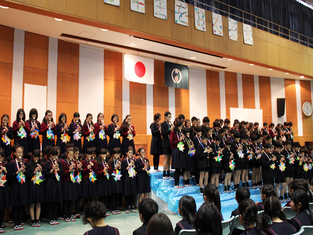 会の最後には1年生から5年生までがこの日の為に、心を込めて作った折鶴を