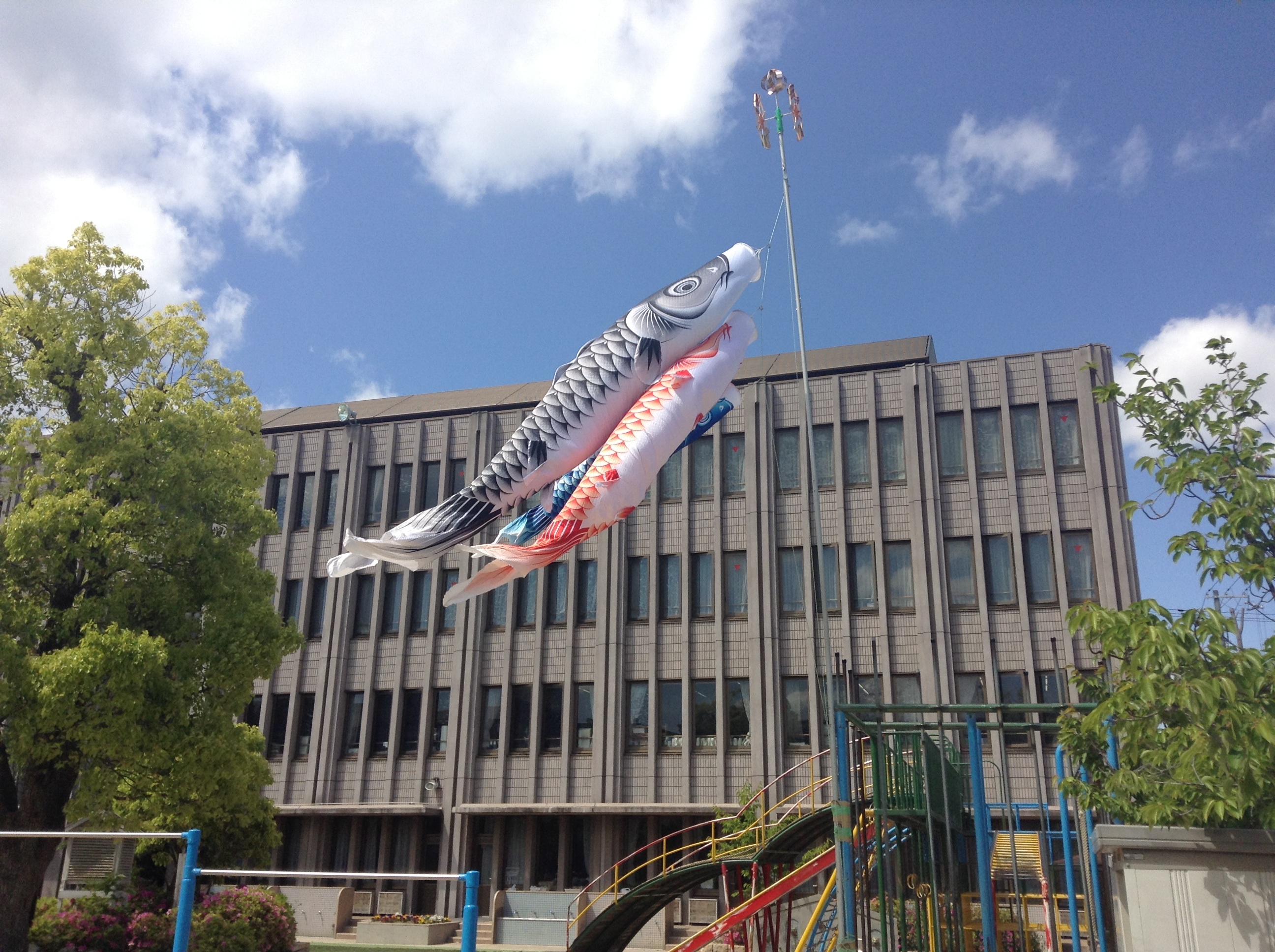 学校のグランドでは、大きな鯉のぼりが、 気持ちよさそうに泳いでいます。