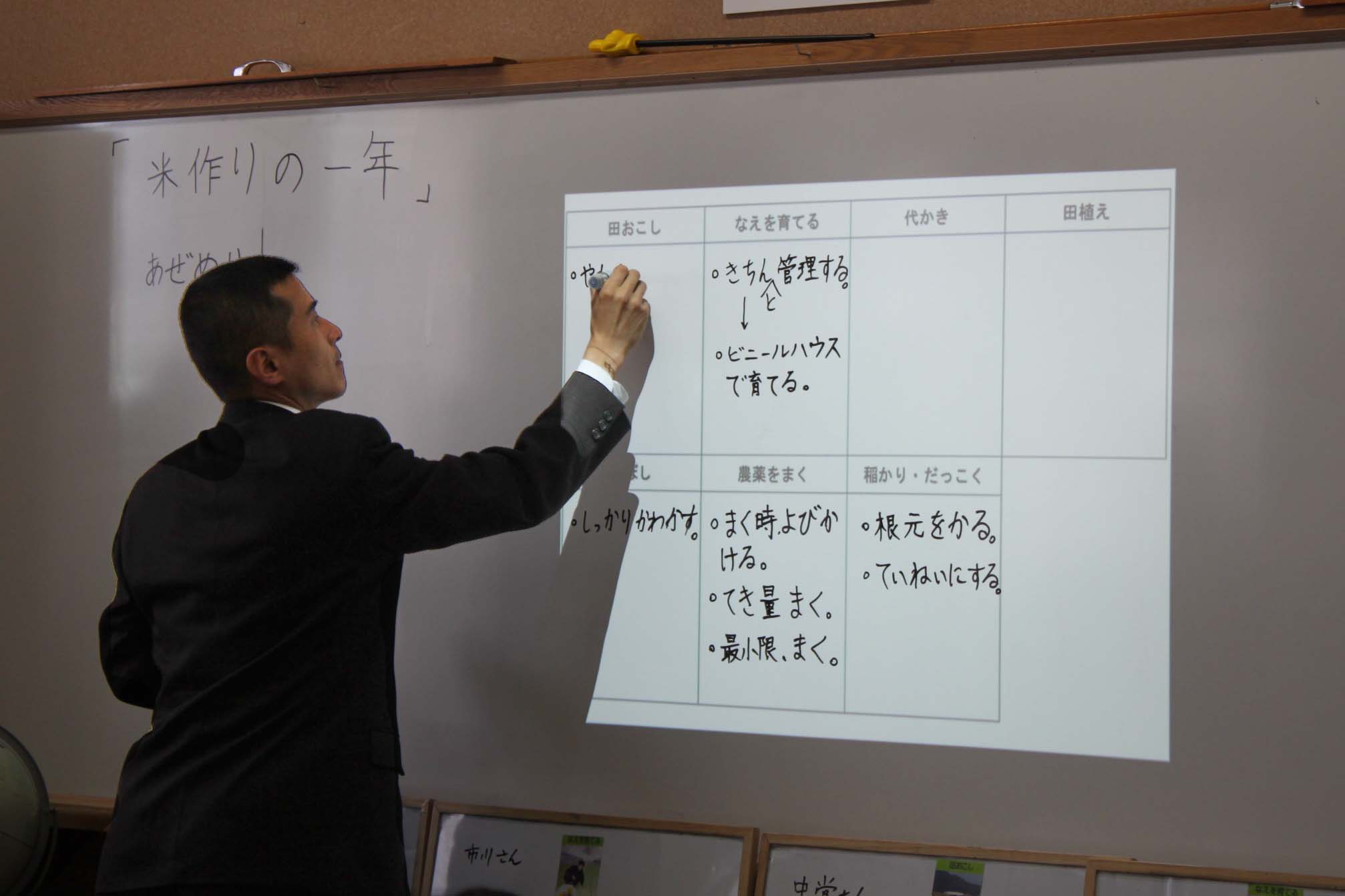 今回の授業では、米袋からその米についての情報を読み取って発表した後、グループごとに分かれて、米作りの手順を予想しました。