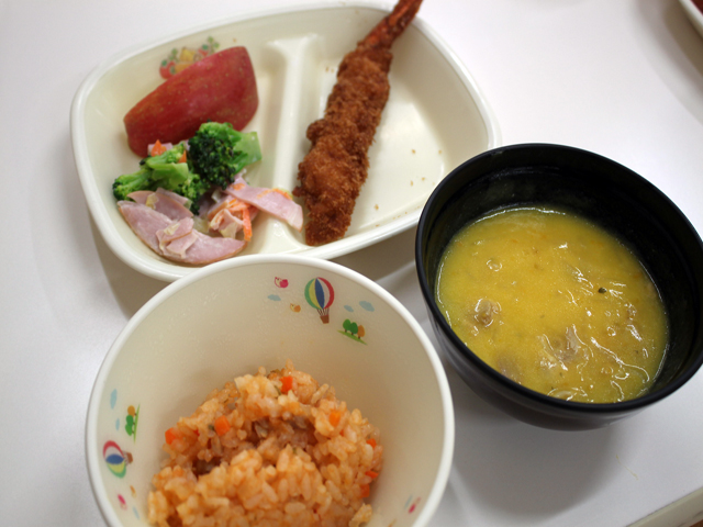 1年生はじめての給食のメニューは、エビフライ・チキンライス・ハムとブロッコリーのサラダ・かぼちゃのスープ・りんごでした。