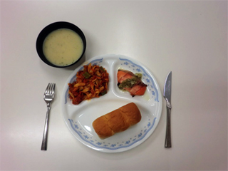 今日の給食は月に一度の楽しみ、ボネールのシェフ考案スペシャル洋食料理でした。