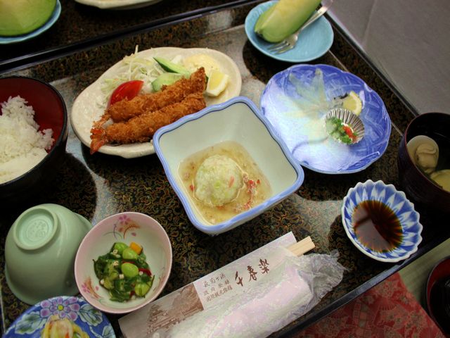 今日の献立は、フグ刺し・エビフライ・蛤のお吸い物・季節の炊き合わせ・夏野菜と昆布の和え物・ご飯・メロンでした。