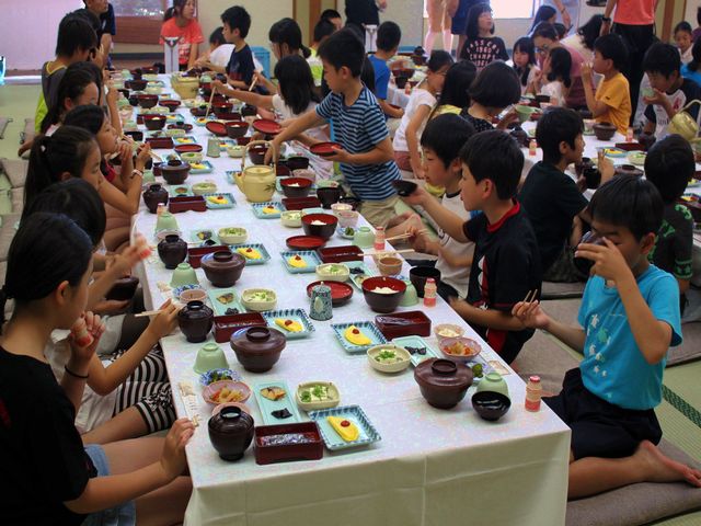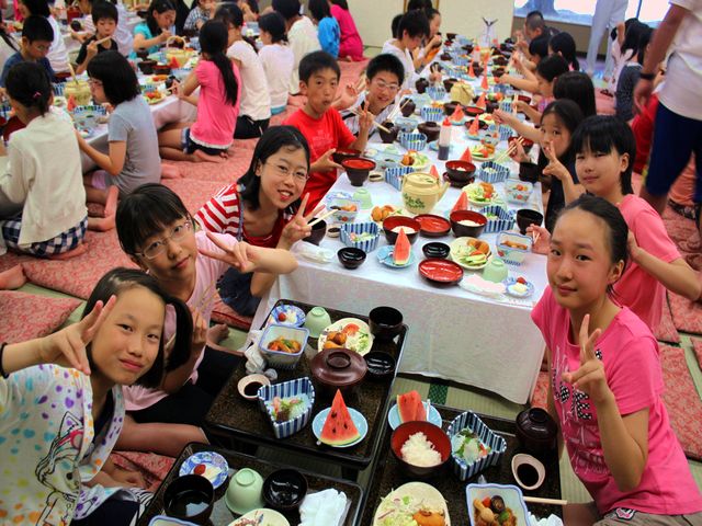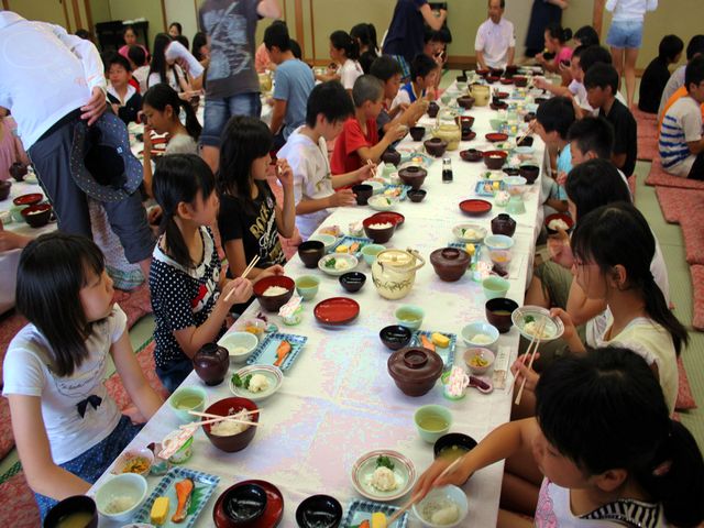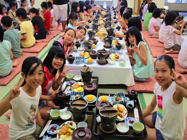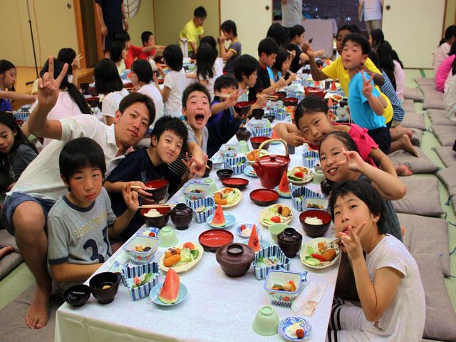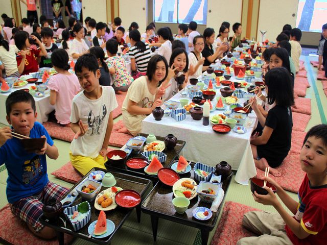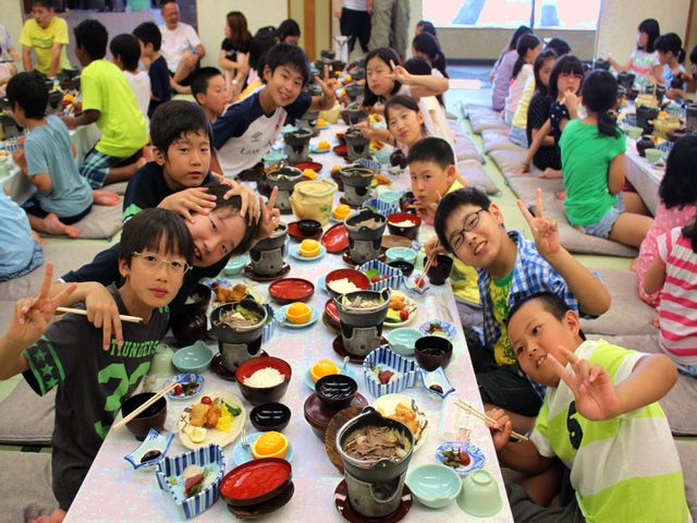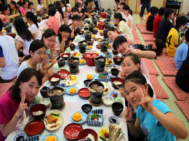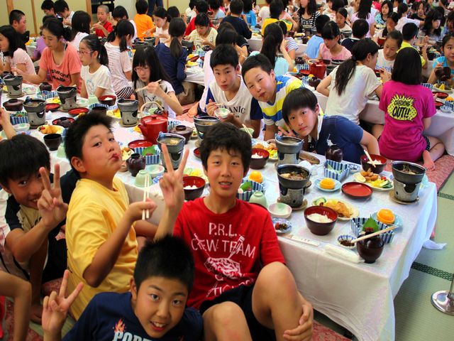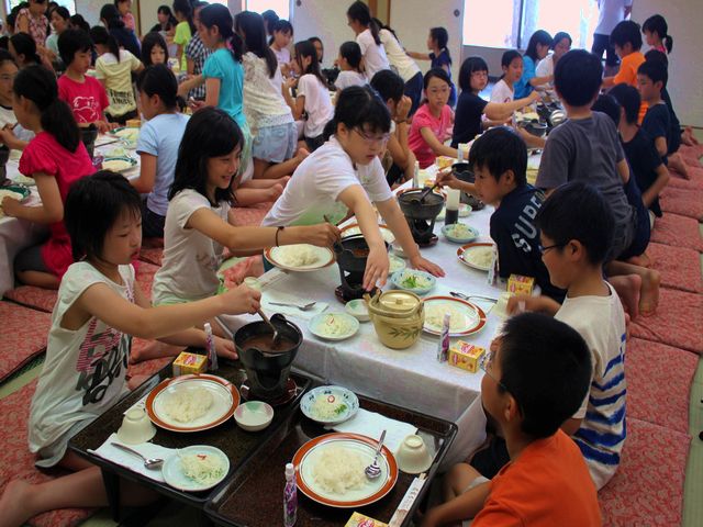 たくさん泳いだ児童たちは、お腹がペコペコで夕飯がとっても楽しみです。