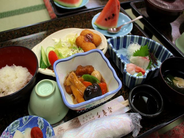 今日の献立は、お造り(白身洗い・甘えび)・酢豚・カニクリームコロッケ・サラダ・お吸い物・ご飯・スイカでした。