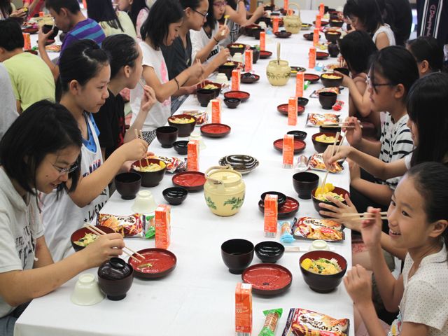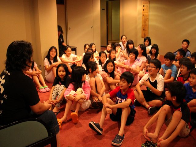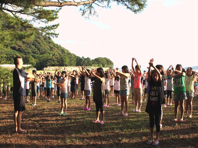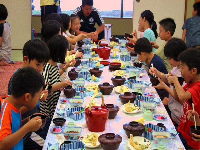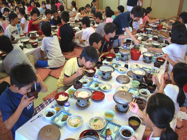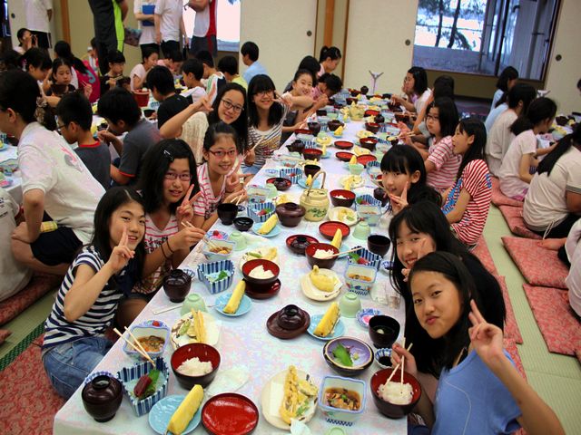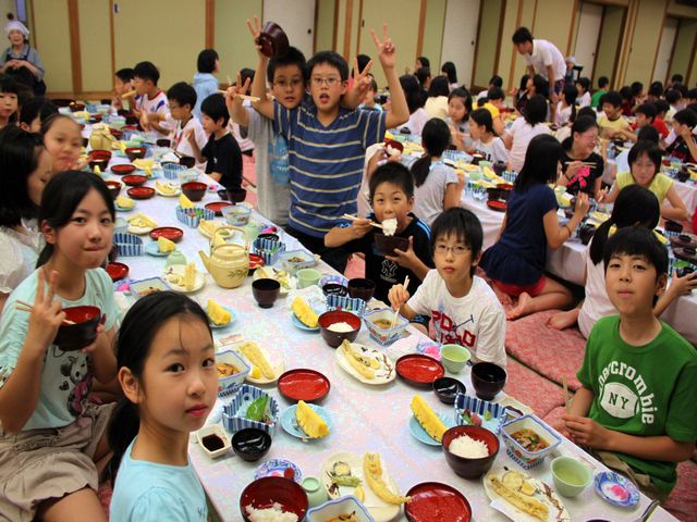 児童たちは、学院伝統の食事の前の歌を元気に歌い、感謝の気持ちを持って、