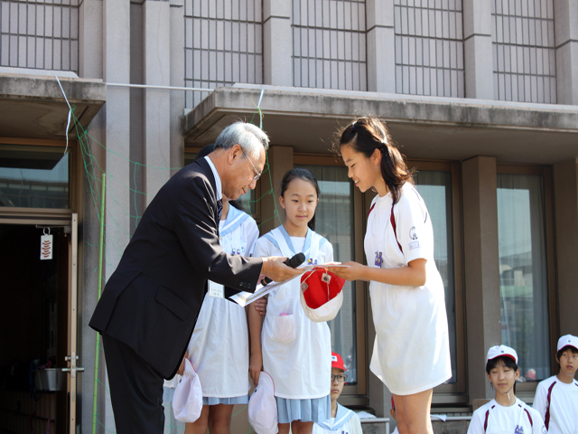 本日、外朝礼にて昨日行われた児童会役員選挙の認証式が行われ、新しい児童会会長・副会長に認証状が渡されました。