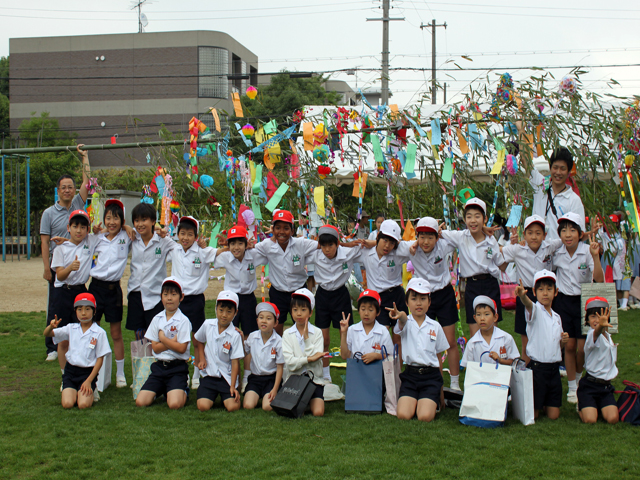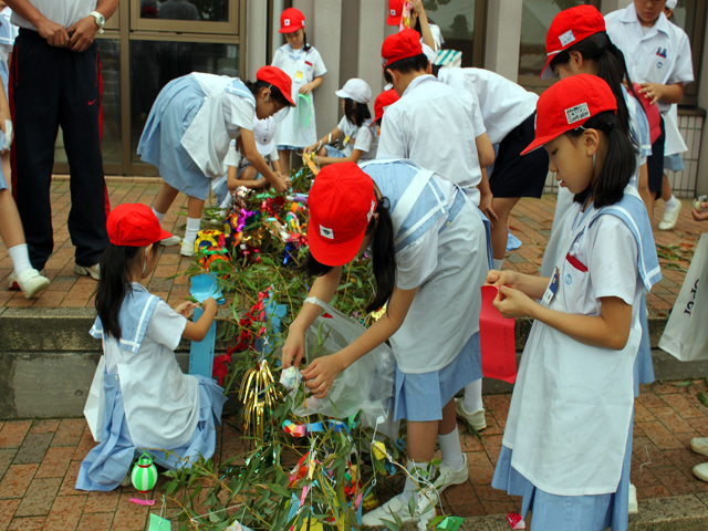 児童たちは、各姉妹学級に分かれ、願い事を書いた短冊や飾りをたくさんつけました。
