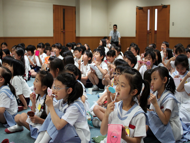 先生の指導の下、実際に自分の歯を磨いてみて、いつもよりキレイに磨けたことを実感すると思わず「わぁ!いつもよりツルツルになったぁ!」と驚きの声が上がっていました。