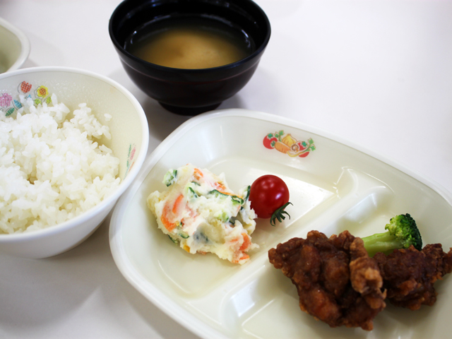 今日のメニューは・・・「タンドリーチキン・ポテトサラダ・ご飯・お味噌汁」です。