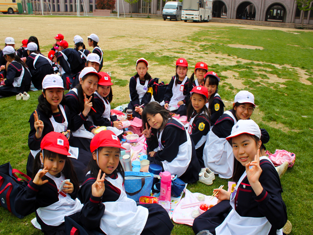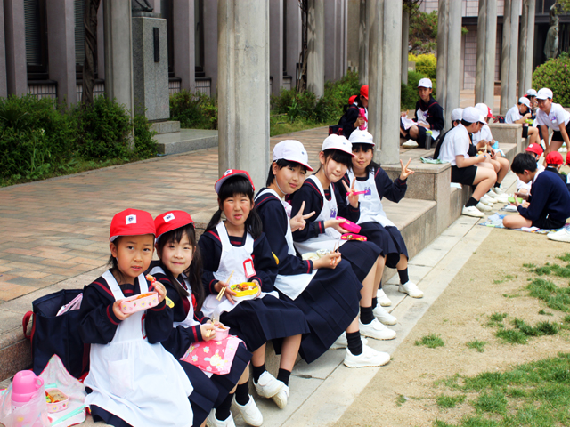 お昼休みにグランドを見ると、1年A組と6年A組が兄弟学級でお弁当を食べていました。