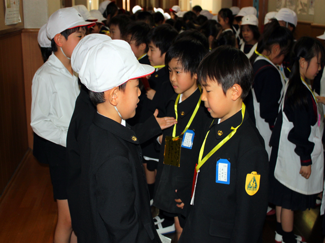 1年生は、2年生のお兄さん・お姉さんに手をつないでもらい、