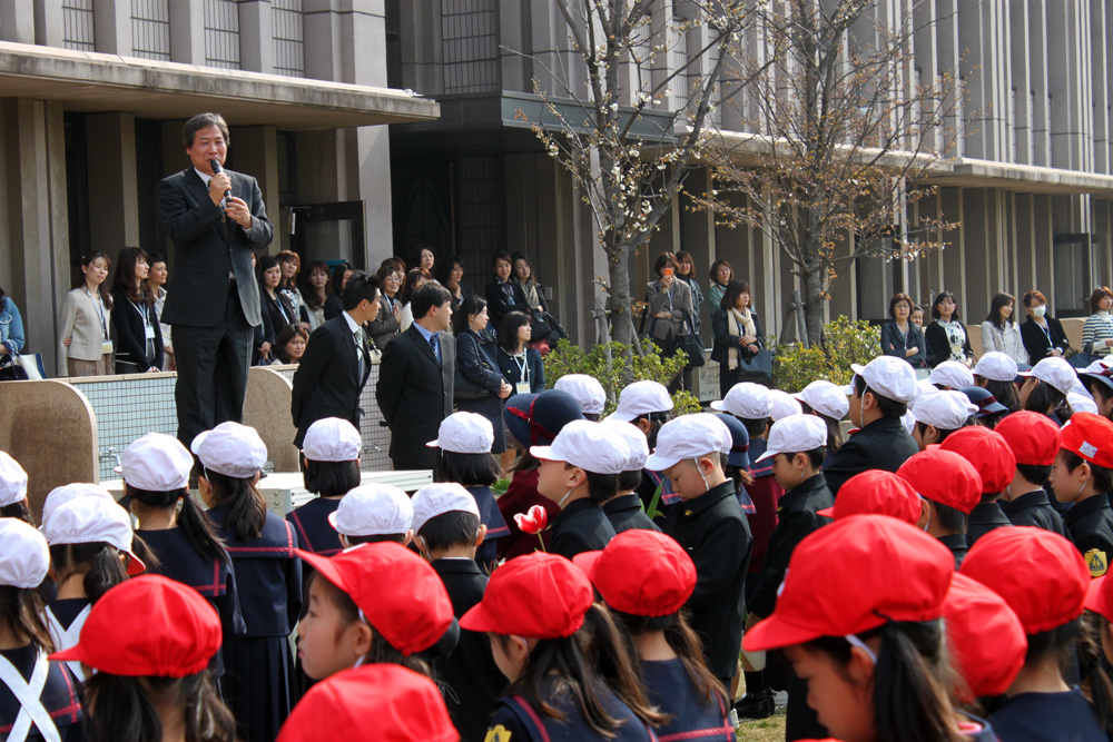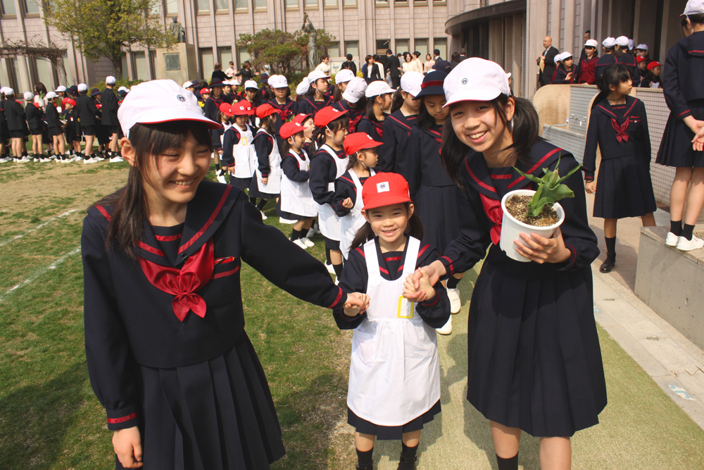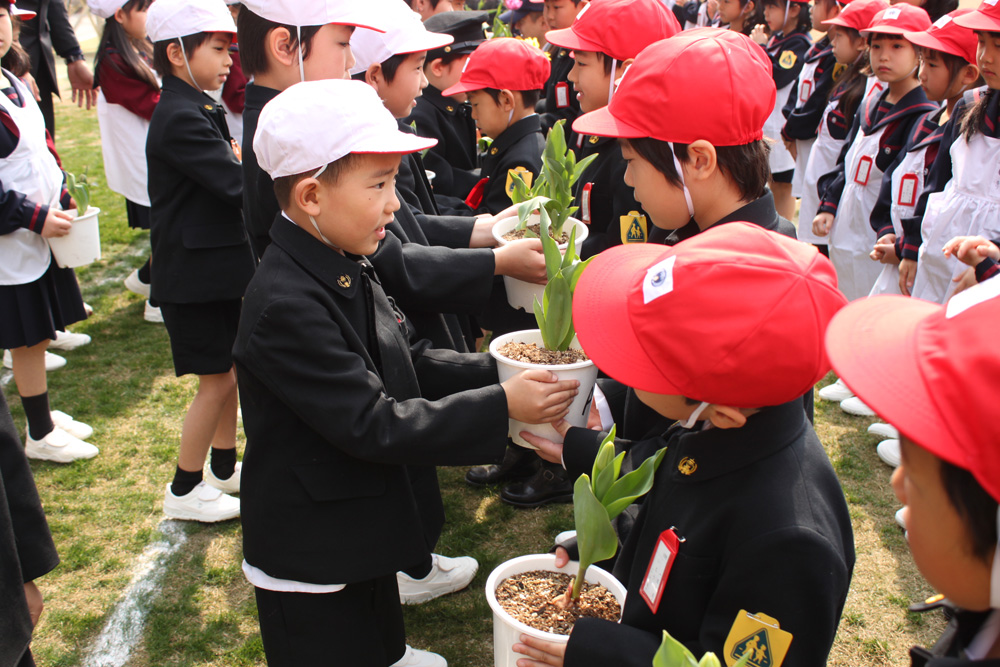 また、1年生は、2年生が育てたチューリップの鉢がプレゼントされました。