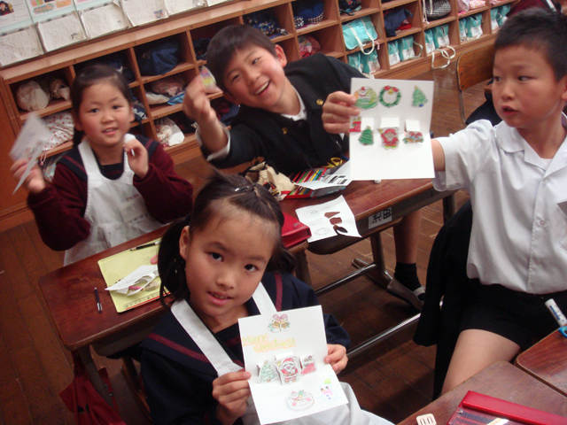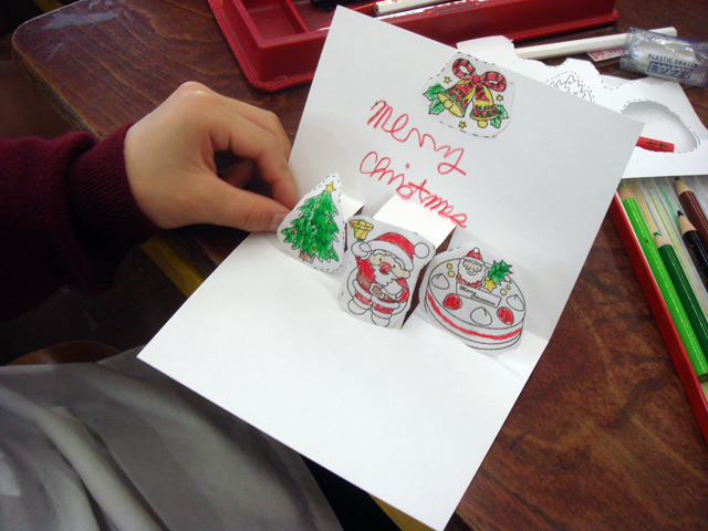 そして1〜4年生の英会話では今年もクリスマスカードを作りました。