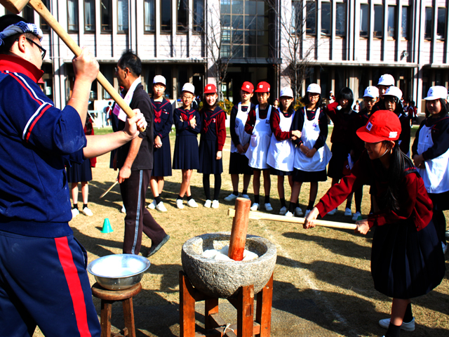 本日、小学校の伝統行事お餅つきを運動場で行いました。