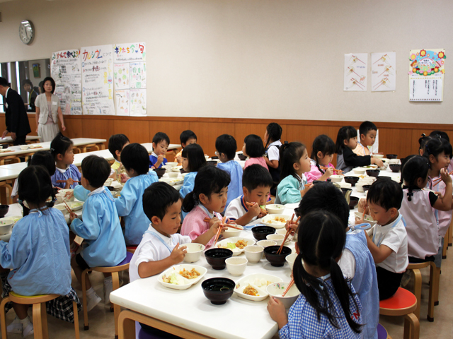 体験給食では、おいしそうにいただく園児たちの笑顔が印象的でした。