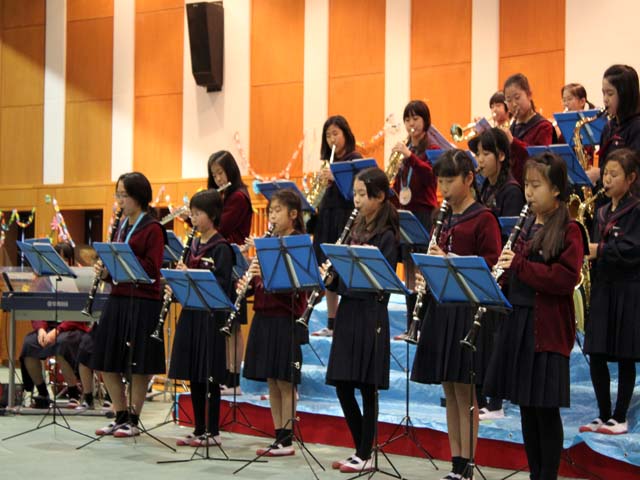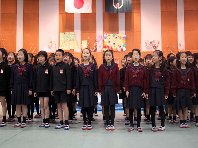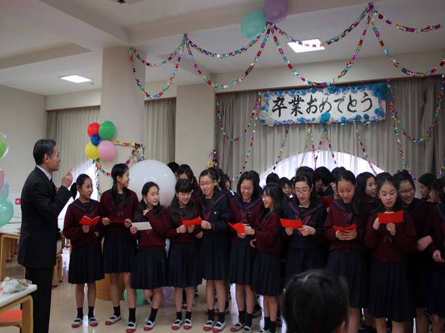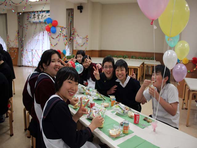 その後、給食場で「祝賀の集い」があり、軽食を食べながら、各クラスの歌を聞いたり、