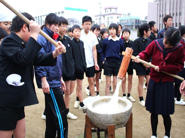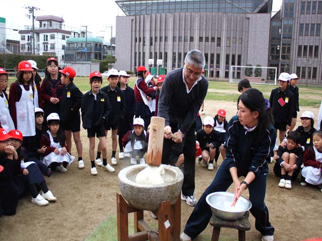 本日、小学校の伝統行事お餅つきを運動場で行いました。