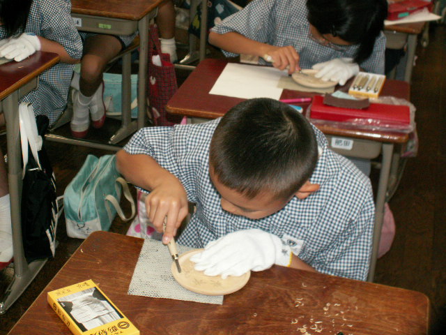 初めての彫刻刀での細かな作業であった為、児童たちの態度は、真剣そのもの。