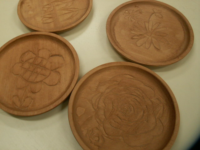 5年生の図工の授業では、彫刻刀を使用して、小さな木のお皿に花の図柄を彫りました。