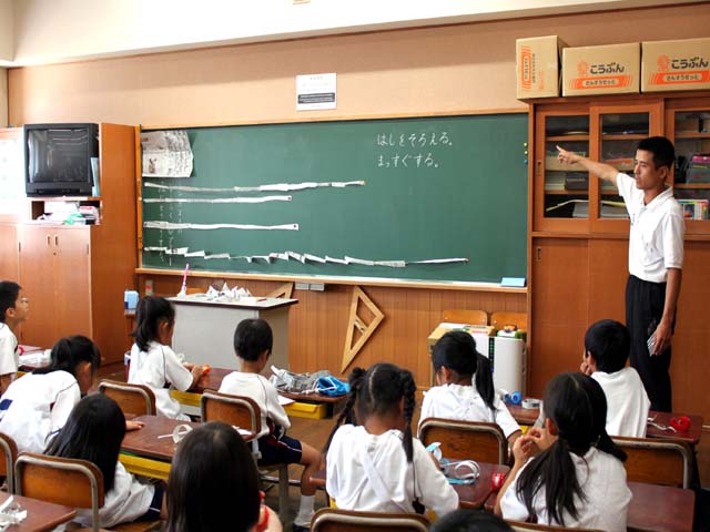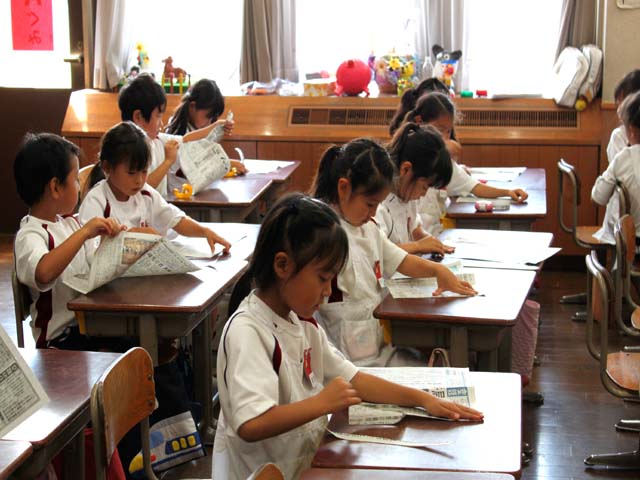 何人かの細長い新聞紙が黒板に貼られ、「端をそろえる」こと、「まっすぐする」ことを確認し、