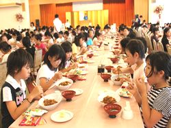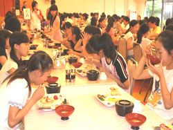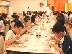 児童たちは、学院伝統の食事の前の歌を元気に歌い、感謝の気持ちを持って、
