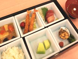 今日の献立は、お刺身(マグロ・ハマチ)・八宝菜・エビフライ・煮豆・お吸い物・ご飯・メロンでした。