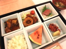 今日の献立は、かつおのタタキ・かに玉・ハンバーグ・ひじき煮・鮪汁・ご飯・バナナでした。