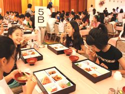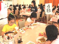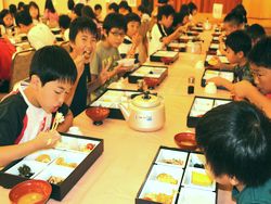 水泳練習を頑張った児童たちは、お腹がペコペコです。