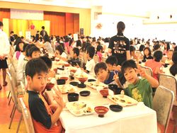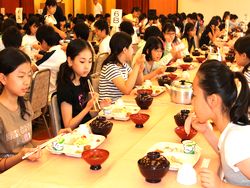 たくさん泳いだ児童たちは、お腹がペコペコで夕飯がとっても楽しみです。