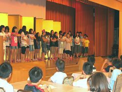 児童たちは、学院伝統の食事の前の歌を元気に歌い、感謝の気持ちを持って、