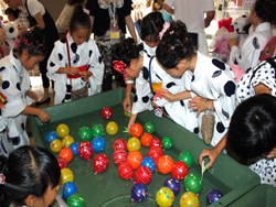 児童たちが金魚すくいやヨーヨー釣りをして楽しく遊ぶ姿が見られました。
