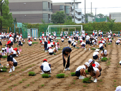 本日、ポットで育てていた芝生の苗を運動場に植えました。