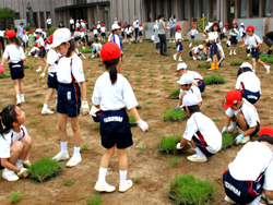 児童たちが、手伝った芝生の苗はすくすく成長しています。