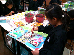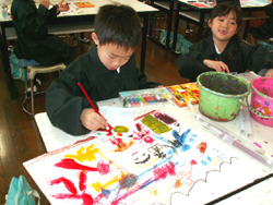 水彩絵の具のことや道具について学んだ後、児童たちは、混色したり、塗っていく喜びを感じながら、 制作を進めていきました。心のこもった楽しい絵が出来上がりそうです。