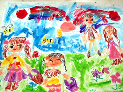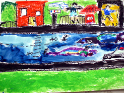 1年生の図工では、クレパスと水彩絵の具を使って、「自分とまち」と言う題で絵を描いています。