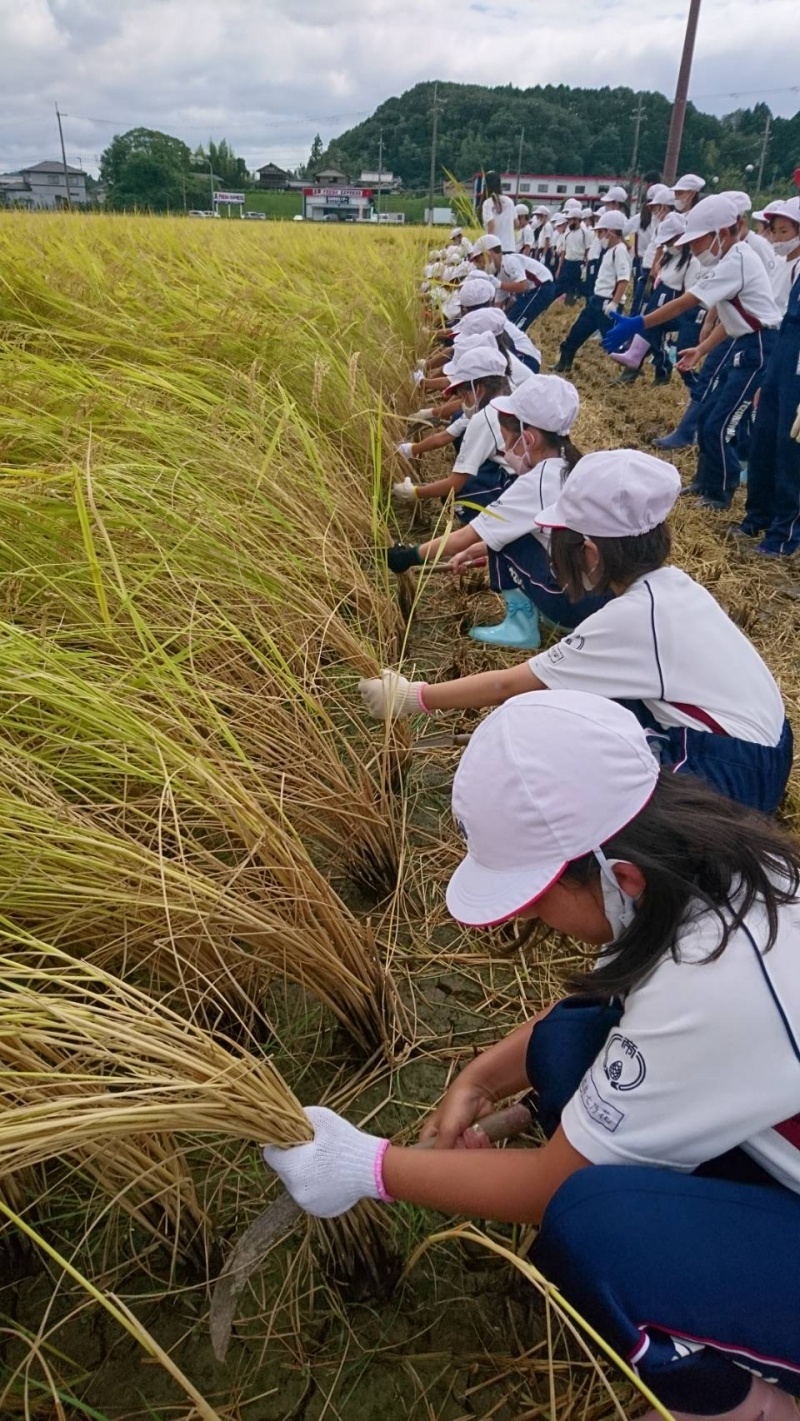 子どもたちは、まず敷地の広さにびっくり。そして、一面に広がる黄金のコシヒカリに大興奮。農家さんが大切に育てた稲の刈り取りを、心をこめてお手伝いしました。