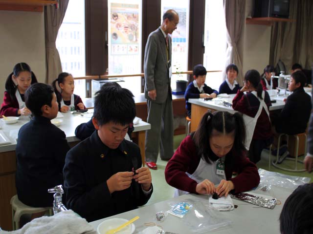 2時間目は、4年生が備長炭の電池づくり、5年生はモーター作りをしました。