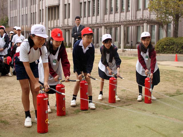 4年生では、バケツリレー、消火器の使い方などを教わりました。