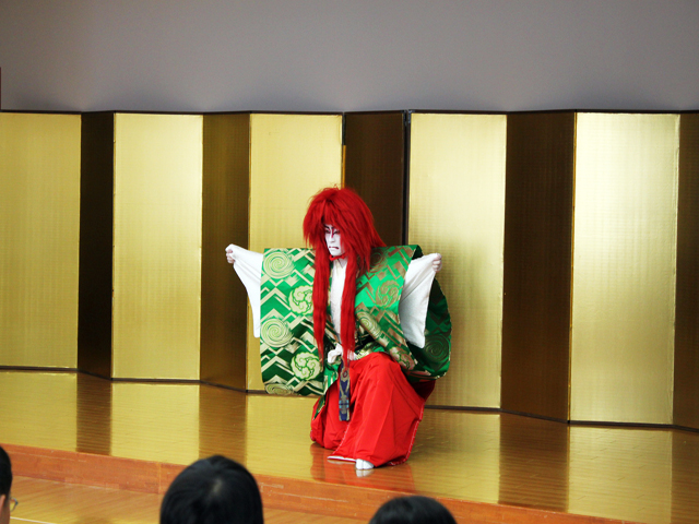 1回目の授業では、歌舞伎役者の方に来ていただき、歌舞伎のお化粧、女形(近江のお兼)と立役(獅子)の化粧行程と舞を見せてもらいました。