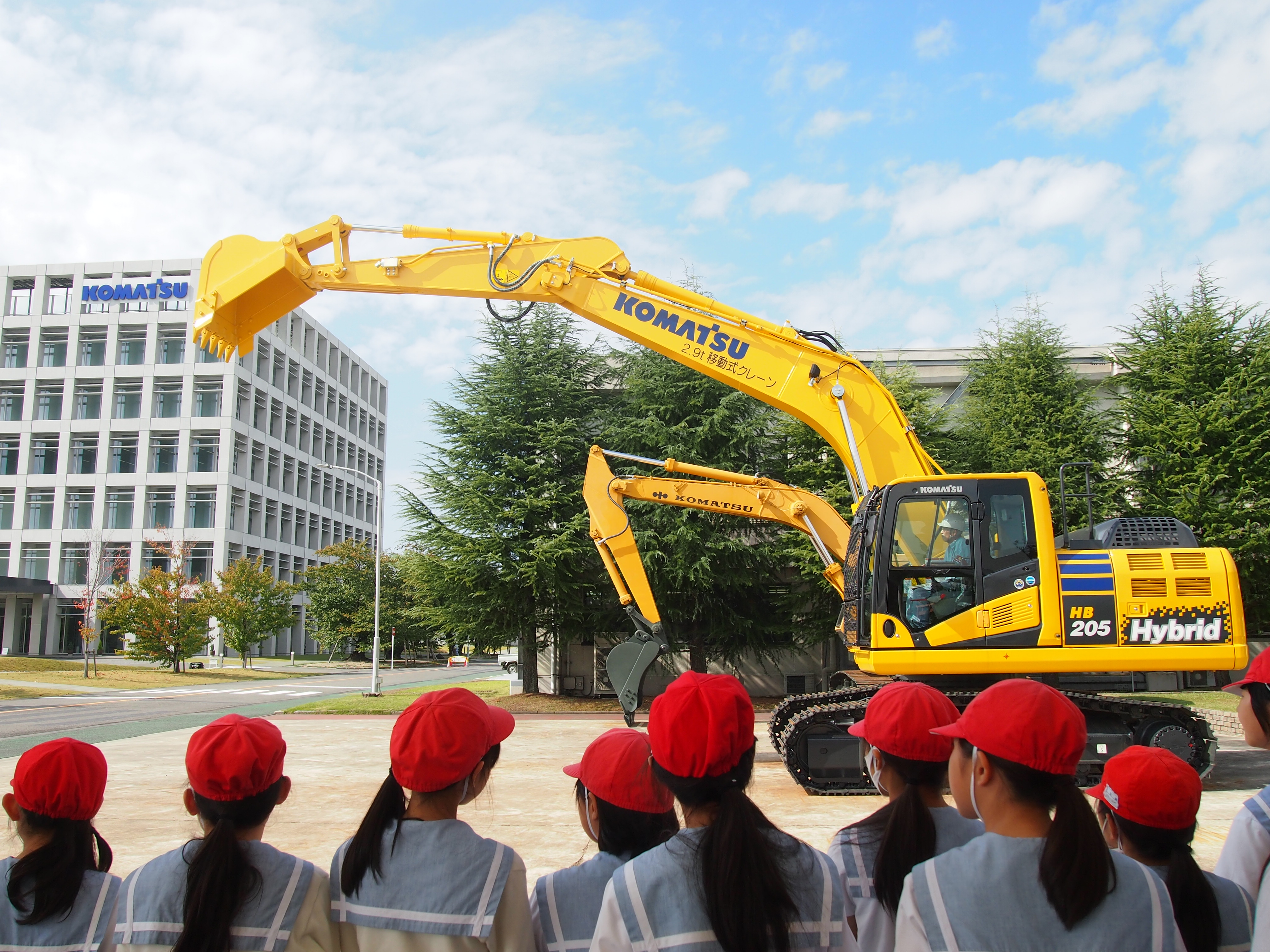2つのグループに分かれて、体験教室、ショベルカーデモンストレーション、油圧ショベルの生産ライン工場見学のプログラムでした。