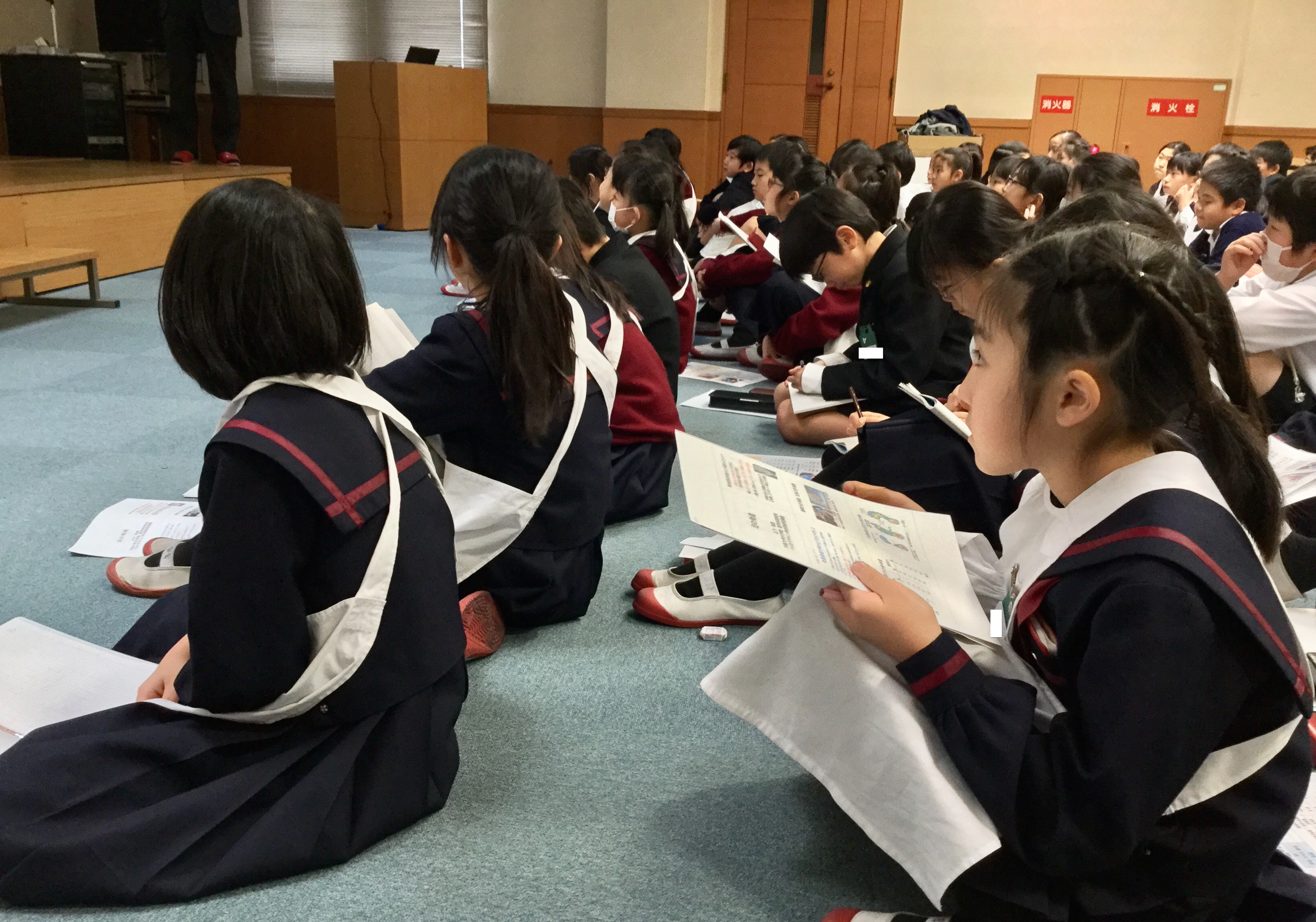 本日3、4年生を対象に、足裏の勉強会が行われました。足の研究をしておられる大阪大学の山下先生に、たくさんの資料を見せていただいたり、様々なお話をしていただきました。児童は初めて聞く言葉にも興味津々で、聞き入っていました。メモをとったり、自分の足裏測定結果資料を確認したりする様子が見られました。