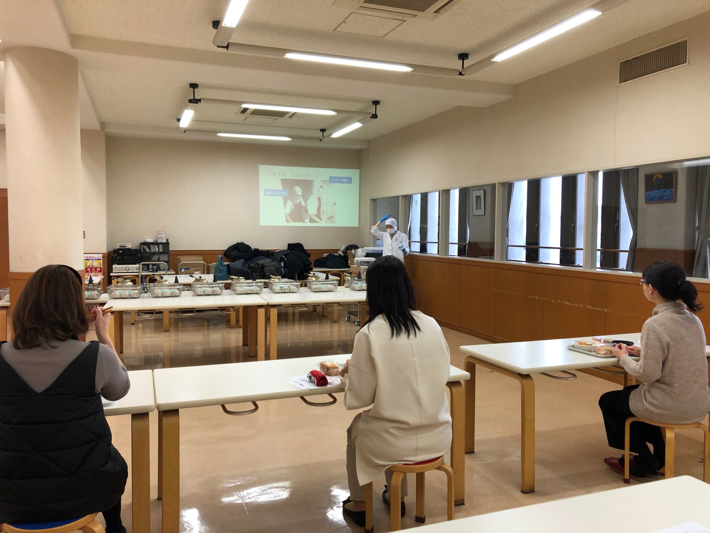 次に衛生面について、給食場の職員の方々の身支度の整え方や日々注意していることなどのご説明がございました。例えば、異物混入を防ぐために、調理場の皆様は青色の手袋をつけておられるそうです。食材には青色がないことから、万が一手袋が欠けた時に発見しやすいという利点があるそうです。あらゆる異物混入の可能性を想定し、対策を講じておられ、感服いたしました。