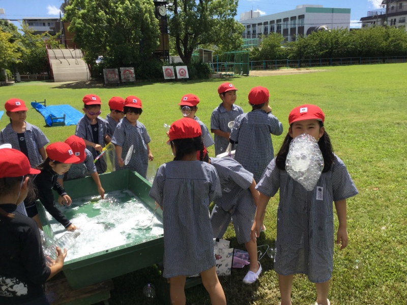 生活科の授業「なつとあそぼう」の単元で、シャボン玉作りと水鉄砲遊びを行いました。